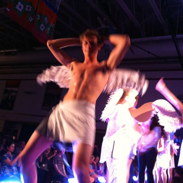 ショー最後のサプライズイベント、卒業生の男の子たちが、裸で腰にタオルを巻いて、背中には天使の羽をつけて、登場しました。