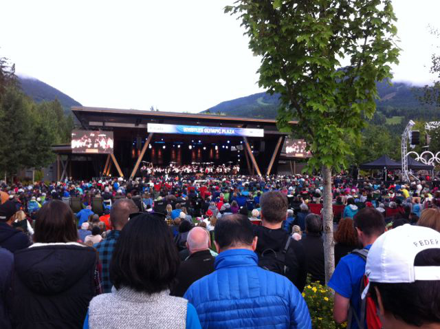 国歌「オー・カナダ」に続いて、チャイコフスキーの序曲やワルツなどが演奏されました。屋外で山を背景に聞くクラシックは最高です。今年の指揮者はおしゃべり好きで演奏の合間にジョークを飛ばすエンターテイナー。とても楽しいコンサートでした。