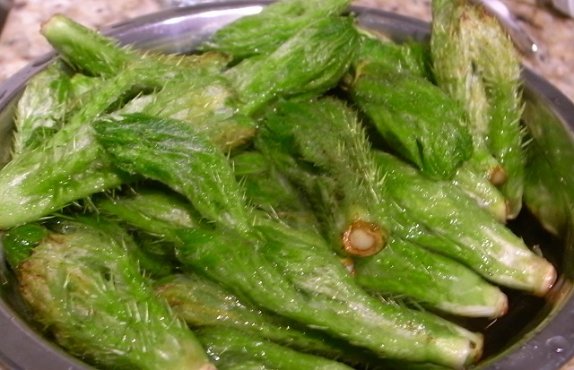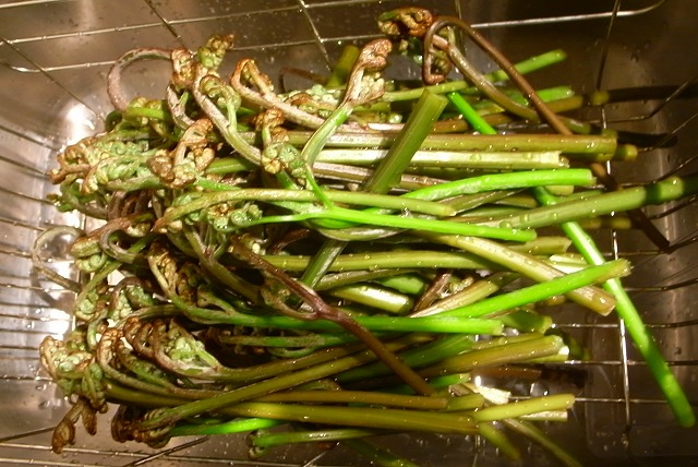 タラの芽 タラ : Devil's club Devil's Club は成長すると直径30センチくらいの葉を大きく広げます。ハイキングやバイクライドに出かけるたびに、この木はイガイガがあって危険だから注意するようにと言われてきました。そのうえ名前が「悪魔の棍棒!?」というわけで、なにか毒のある恐ろしい植物というイメージを抱いていました。まさかこの植物を食すことになるとは夢にも思っていませんでした。しかし調べてみると、この植物にはさまざまな薬効があり、ネイティブ・インディアンも、幹や根を薬として用いてきたそうです。芽から鱗!?もとい目から鱗です。