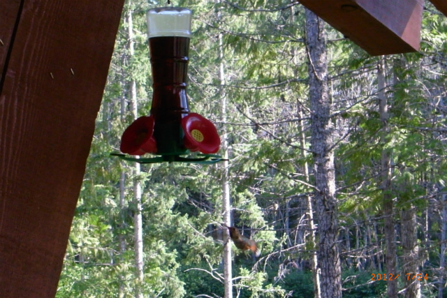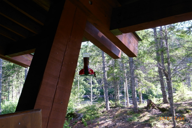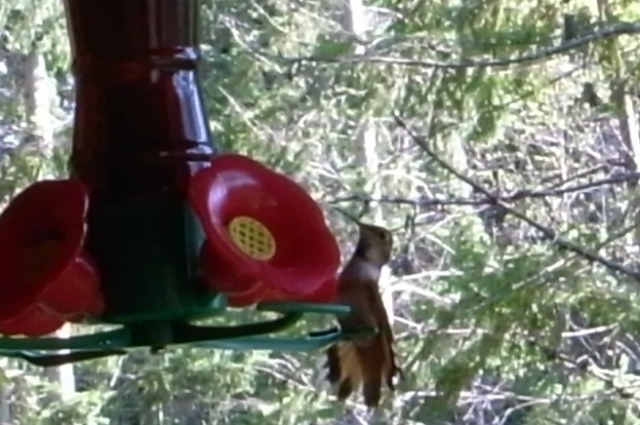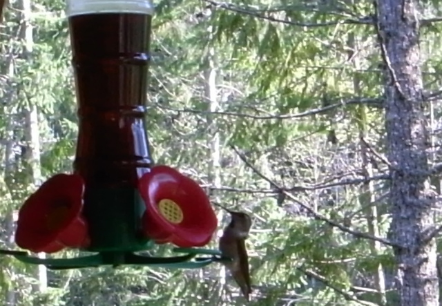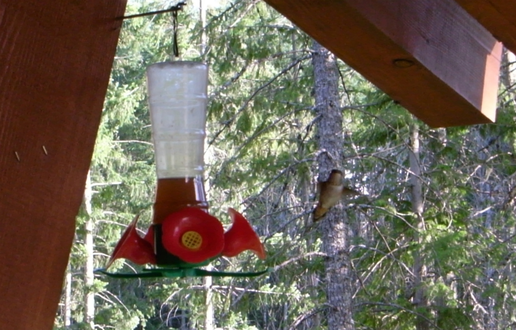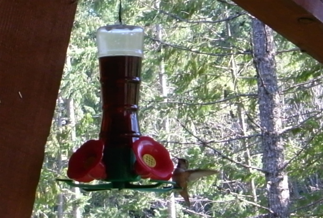 軒下に蜜の入ったフィーダーを吊るすと、ハミングバードがやってきます。蜜はブラウンシュガーを水で溶いて作ります。
