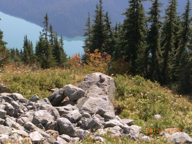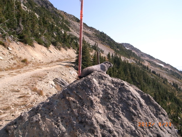 しばらく歩いたところで、前から来たハイカーが、少し先にマーモットがいるよと教えてくれました。ここには2匹いましたが、一匹はとっと岩陰に隠れてしまいました。もう一匹もこのあと岩陰に隠れました。けっこう距離があったのですが前に出会ったマーモットほど人慣れしていなかったようです。