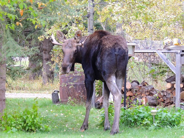 キッチンの窓から、何か外で動く大きな影を発見!いそいで表に回ると、家のすぐ前をムースが横切って行きます。