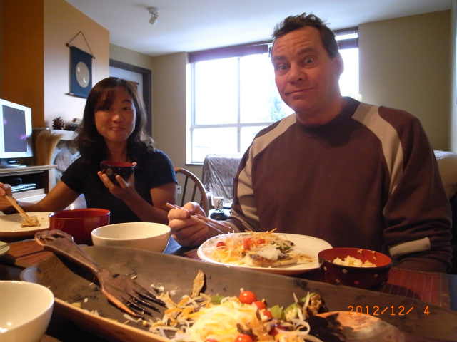 少し遅れて、陸も仕事を抜け出してやってきました。じつは料理上手の Hiromi の手料理がお目当て? おしゃべりしながら、おいしそうに食べています。その後、私が持って行ったブラックライス・プディングを食べて、陸は急いで仕事に戻ってゆきました。