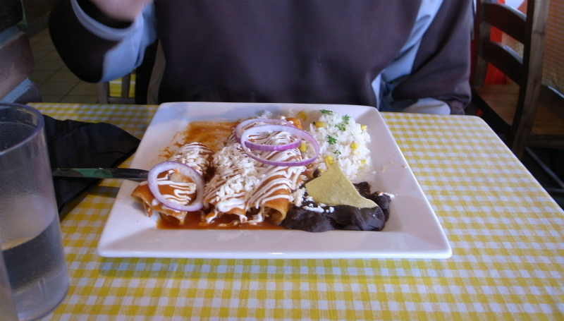 陸の注文したのは、チキンの Enchiladas。コーンのトルティーヤにチキンが巻いてありスパイシーなトマトソースとチーズがかかっていて、ライスとリフライド・ビーンズ が添えてあります。