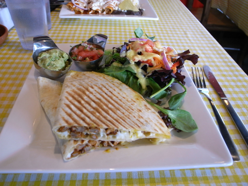 私が注文したのは、ポークの Quesadilla。Enchiladas より厚めの皮で、二つ折りにしてポークとチーズが挟んであります。サルサとワカモレ、そしてサラダが添えてあります。