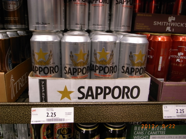リカー・ストアで、どのビールにしようかと物色しているとき、サッポロビールのプライスタグにカナダ産のマークがついていることに気づきました。