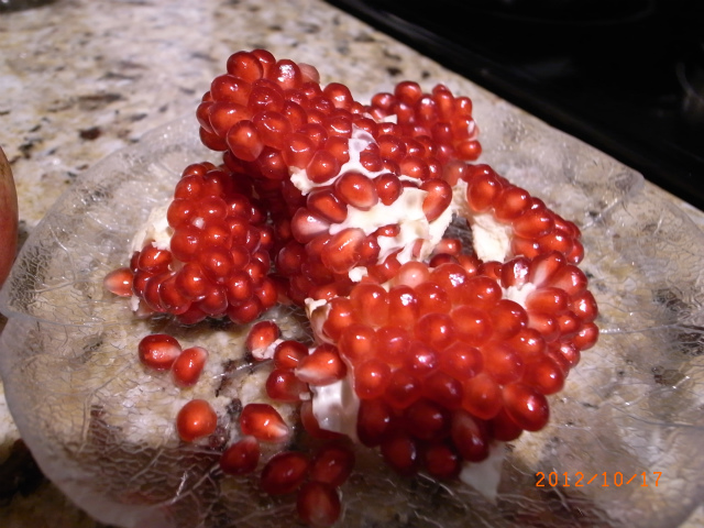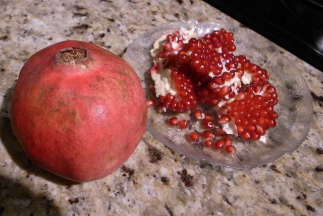 夜9時過ぎに帰宅するころにはすっかりお腹が空いて、ハーブティーとパンプキン・パイやレモン・パイを食べるのが日課になっています。この日はデザートがきれていて、陸はポップコーンを食べ始めました。喉が渇いていた私は、フルーツが食べたいと冷蔵庫を開けると、スーパーで買ったポメグラントが。
