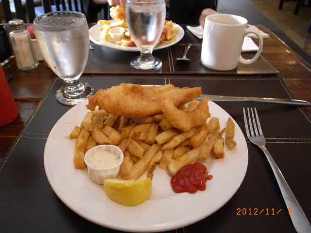 この日は、車で30分あまりのスコーミッシュまで買い物に行きたいとのことで、スコーミッシュでランチすることに。日本食かインド料理、どっちがいい?なんて言ってたのですが、行ってみると両方お休みでした。そこで フィッシュ&チップスの店に行くことに。