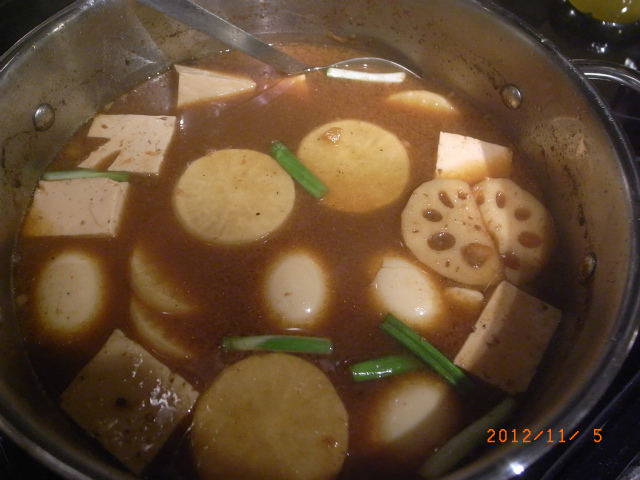 大根、ゆで卵、豆腐、レンコン、を入れて煮てみました。かなりおでんに近い味わいです。