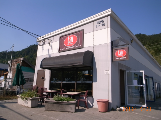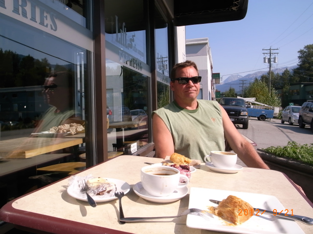 バイクを持って行ったお礼に陸が美味しいコーヒーをごちそうすると言ってカフェに連れていってくれました。このカフェのペイストリーも美味しいそう。行ってみると、日本人の女性が働いていました。陸が彼女も神戸出身だよと紹介してくれます。ウィスラーに来て9年目とか。