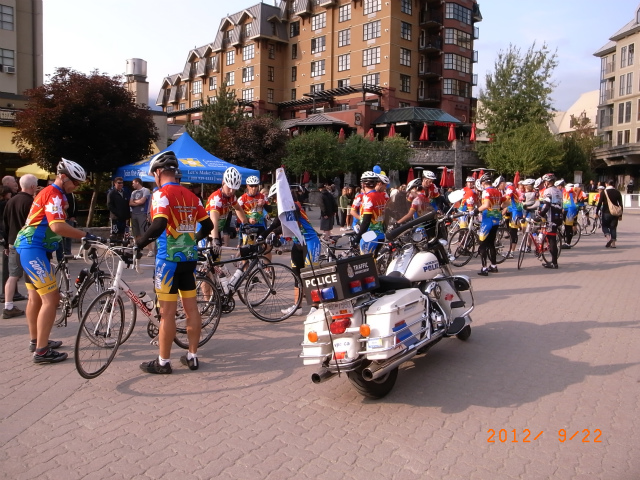 スキーのシーズンパスを買いにヴィレッジに出かけました。陸は好きなだけ滑りに行けるシーズンパス、 私は10回券の エッジカードを購入。この時期に買うとシーズンパス 1489ドル、10回券の エッジカード 649ドルしますが、私たちは春に予約して予約金を払っておいたので、一割あまり安く買えました。チケットオフィスから出てくると、白バイがサイレンを鳴らしながらスクエアに入ってきました。何事!? と思って見ていると、白バイに続いてロードバイクに乗った集団が入ってきました。