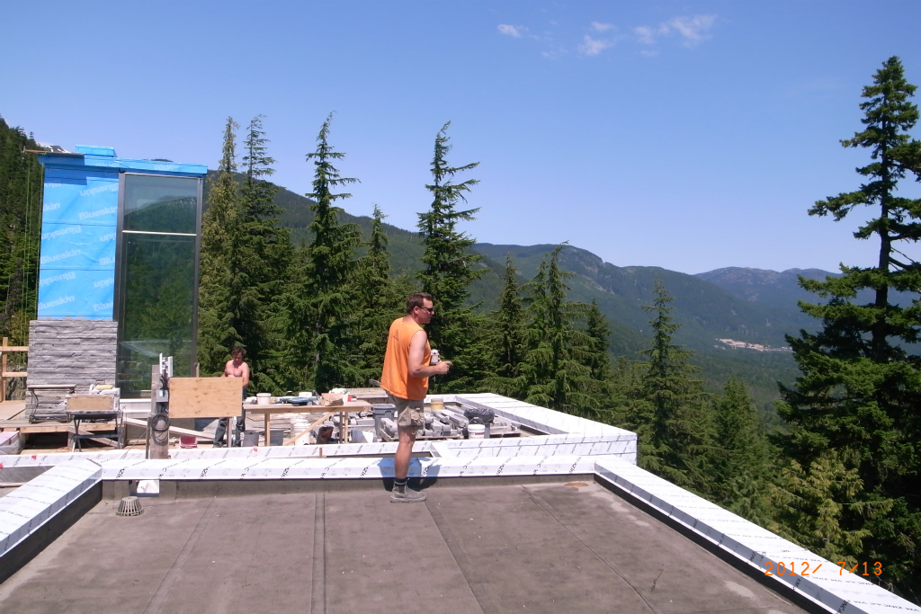 屋根の上ではスカイライト(明りとり窓)の周囲を石で仕上げる職人さんが働いていました。
