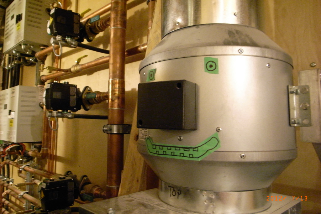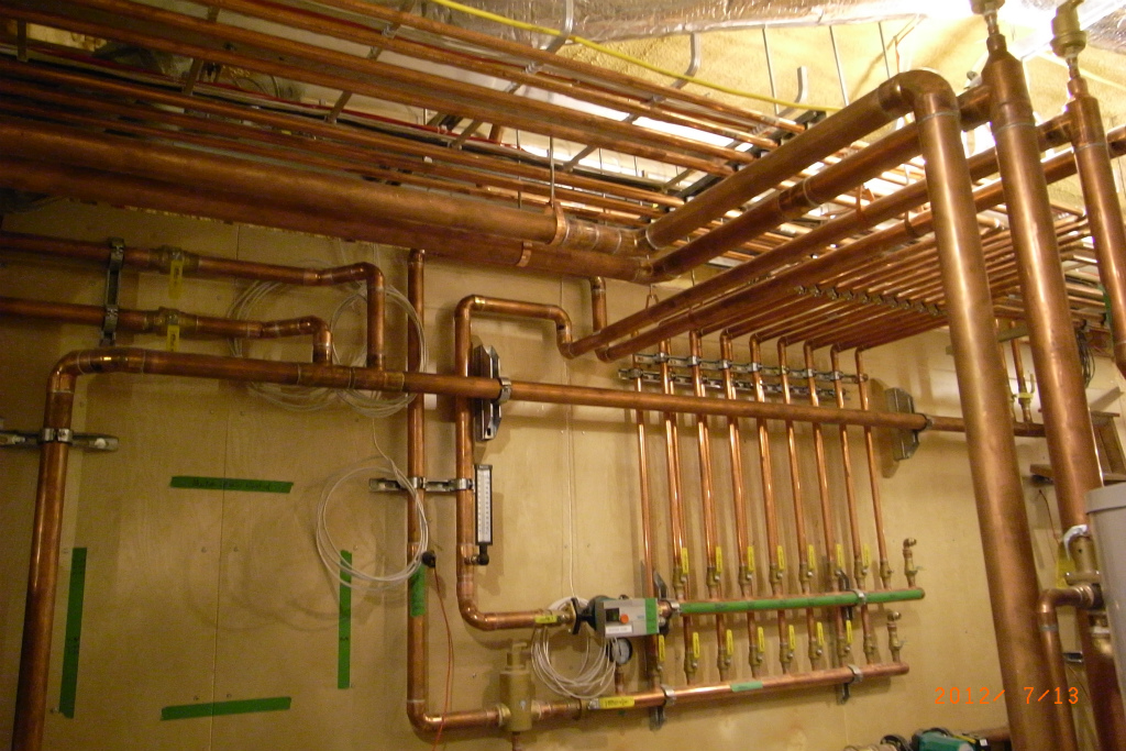 この建物はgeothermal(地熱)を利用して冷暖房をするそうで、機械室は数えきれないパイプが張り巡らされています。