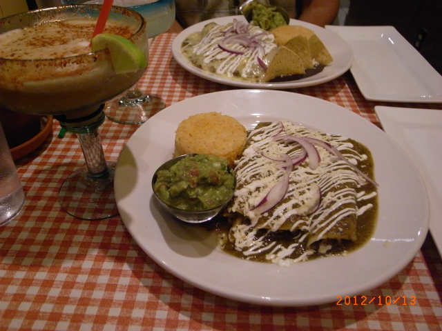 料理がきました。あれ、エンチラーダとタコスを注文したはずなのに。どうやら隣のテーブルの料理が間違ってこちらにきたようです。お詫びにもう一杯マルガリータをと言ってくれたので陸はおかわり、私はいっぱいで十分なので辞退。