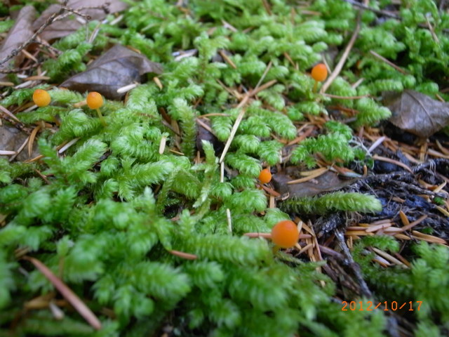 こんどは鮮やかなオレンジのこれまた小さな小さなキノコ。