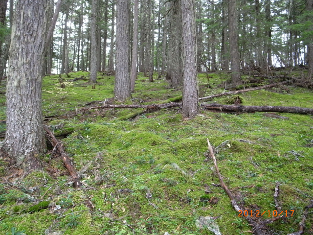 林の中の苔も色鮮やか。こういう場所にたくさんキノコが生えるのですが、今年はまだぜんぜん生えていないようです。