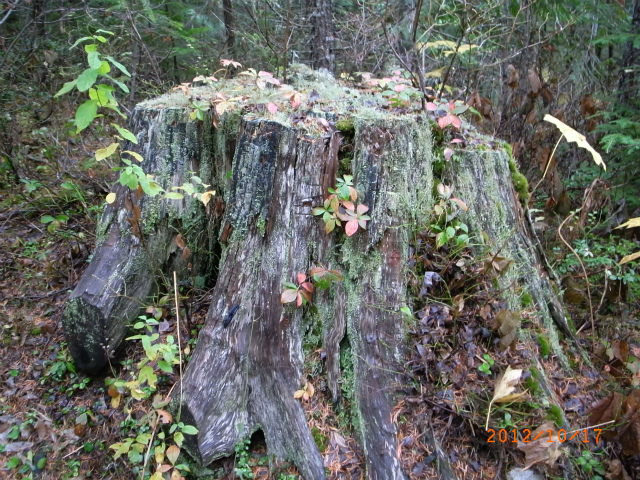 雨のおかげで鮮やかさを増した苔と色づいた葉っぱで、切り株がデコレーションされていました。