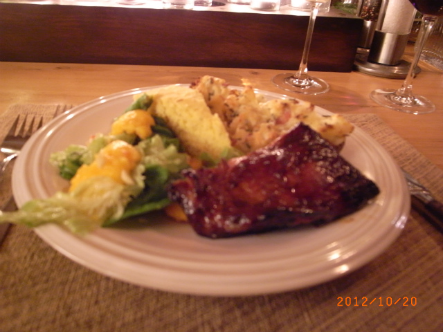 料理ができあがりました。メインはマーティが3時頃から焼き始めたスモークポークリブズ。このとき、すでに夜の9時近かったので6時間がかりで焼いたことになります。サイドにはダブルベイクドポテト、コーンブレッド、そしてザクロとパパイヤの入ったサラダ。かなりのボリュームです。