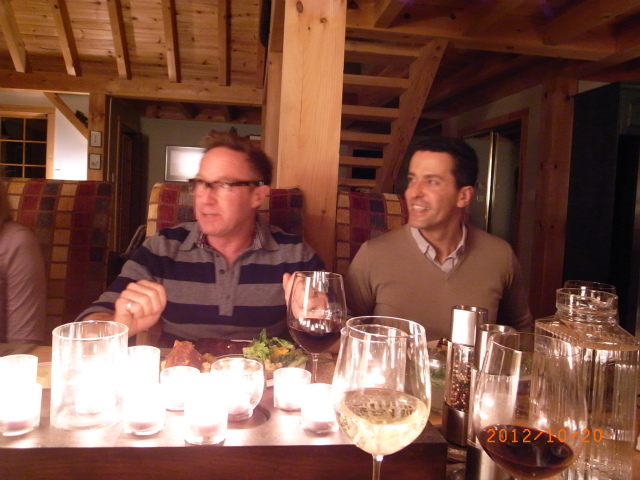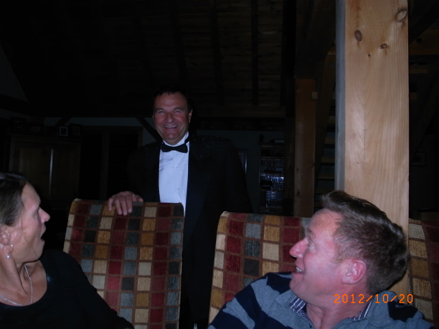食事をすませたころ、別のパーティに参加していたパットとブリンダがやってきました。ドレスコードがブラックタイパーティだったとのことで、パットはタキシード姿。ふだんは冴えない小太りのおじさんですが(パット、ごめんなさい!)この日は見違えました。10年ほど前に買った50ドルのスーツとのことですがバッチリきまっていました。ウィスラーの住人のほとんどは普通のスーツすら持っていないそうで黒いセーターなどで現れた人も多かったとか。銀行のマネージャですらスーツを持ってなかったとのこと(笑)