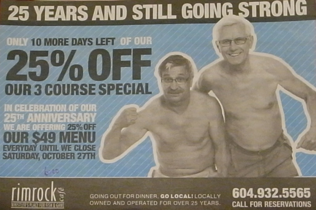 高級レストランとは思えないデザイン。 知らない人が見たら、とても行く気にはならないでしょう。ローカル向けならではの広告です。写真のおじさん二人がこの店のオーナー・シェフとオーナー・マネージャー。「25年経ってもまだまだ盛ん」と書いてあります。今年は開店25周年で、49ドルの3品コースのスペシャルメニューをさらに25%オフ。ややこしい……前の広告では週末は49ドル、平日はさらに25%オフとなっていましたが、最後の10日間は週末も25%オフになったようです。