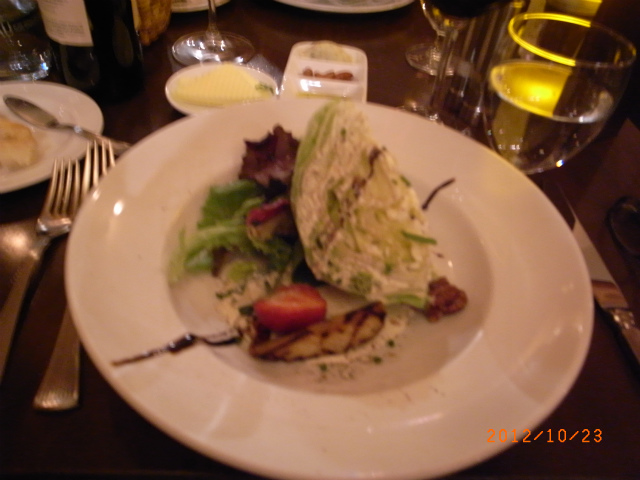 シーフードの前菜 a crisp wedge of iceberg lettuce showered with gorgonzola dressing, grilled pear & spiced pecans
