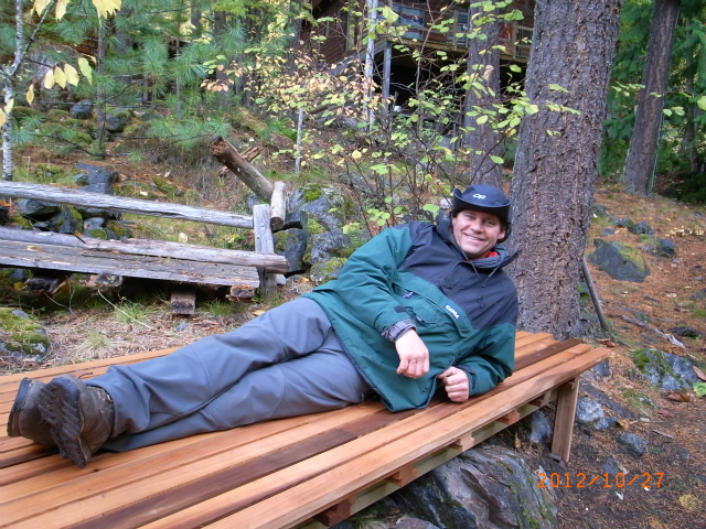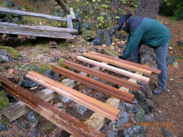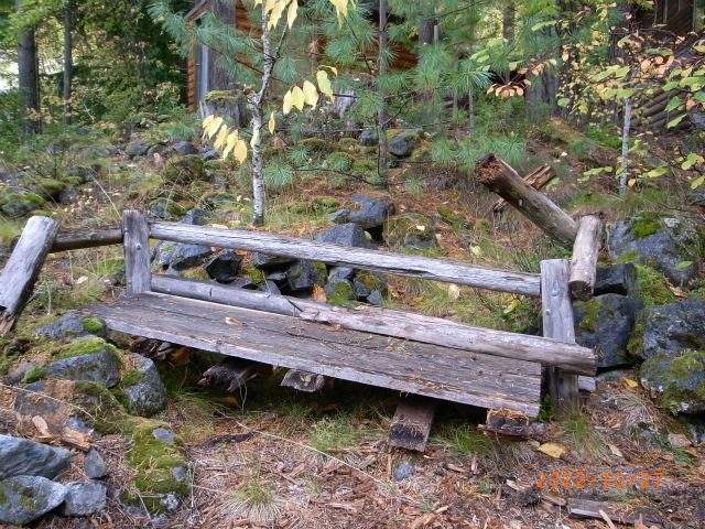 ファイヤーピット脇のベンチがすっかり朽ちてしまっています。 ちょうど、陸が仕事場で余った木材を貰ってきたので、このベンチを新しくすることにしたのです。 細かい雨が降り続いていますが、さいわい雨脚は強くありません。けっこう冷えていたので、キャビンのファイヤープレイスに火を入れて暖をとってから作業を始めました。