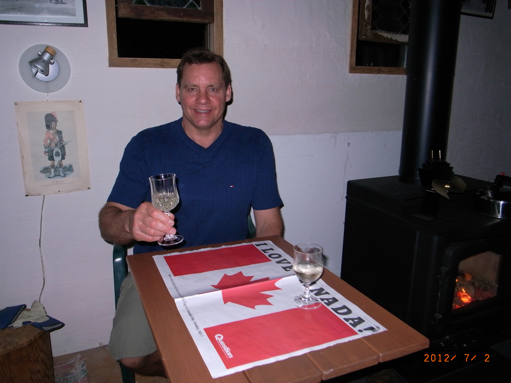 そこで今年は山奥のキャビンで静かなカナダデーを過ごすことにしました。夜は、新聞の折り込みに入っていたカナダの旗をテーブルクロス代わりにしてみました。外は少し寒かったので、デッキのテーブルと椅子をファイアープレイスの脇に運んで夕食にしました。