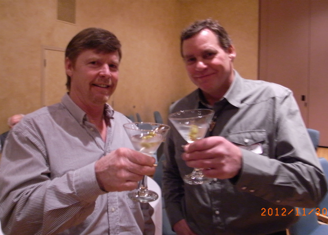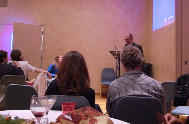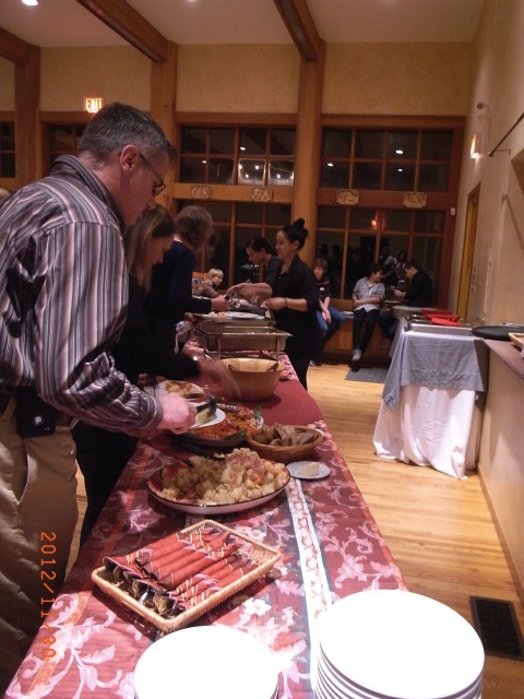 立食パーティだと思っていたら、テーブル席も用意されたディナーパーティでした。7時スタートで最初の一時間半ほどは、飲み物片手に前菜をつまみながら歓談します。お寿司や、スペアリブ、エビのソテーなどなど、どれもとても美味しく、上質な料理でした。日本人のカップルがいたので話を聞いてみると、ご主人は夏はカーペンター、冬はヘリスキーのガイドをされていて、こちらに住んで12年ほどとか。お子さんは一人、小学校2年生のケンタくん。奥さんと話していると、マーティのパーティで会った、教師のドンがやってきました。ドンはケンタくんの担任の先生だったとか。そして、ドンはマーティとリンも来る予定だから、テーブルの席を確保して一緒に座ろうと言います。どうして、マーティとリンもこのパーティに!?と不思議に思っていたら、インテリア・デザイナーのリンが、この会社からも仕事を受けているそうで招待されたとか。小さな町なので、いろんなところでいろんな人が繋がっています。
