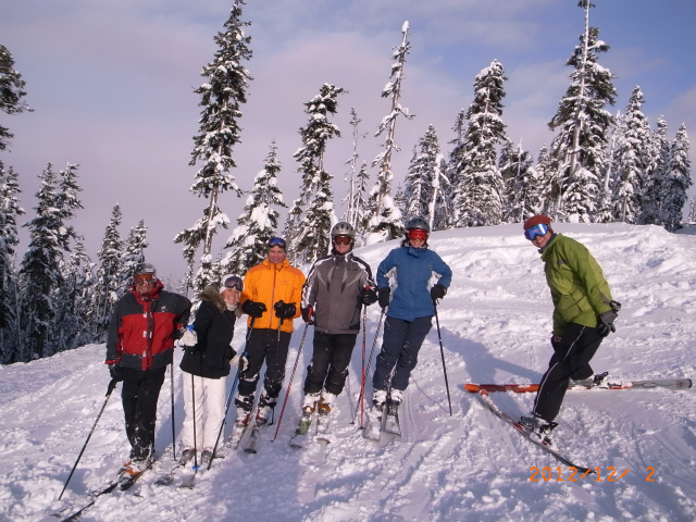 Peak to Peak を降りて、Hiromi に電話すると、ほかのメンバーと11時15分にレストハウスで会うことになったと言うので、二人で数本滑ってから合流。前夜、一緒に映画を観たメンバが揃いました。