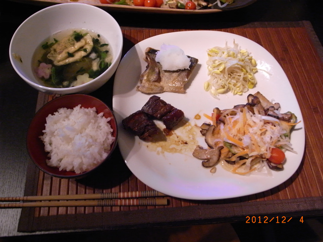 なんと、この日は日本食を用意してくれました。サバの塩焼き、豚の角煮、大根サラダともやしのおひたし、そして Tomoko さんが日本のお土産に買って来てくれたという、麩のなかに具の入った高級そうな即席の吸い物も! う〜ん、シアワセ。。。