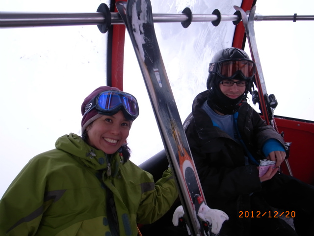 前夜から降り続いた雪は日中も降り続いて、天気のいい日しか滑りたくない私とローラにとっては、残念な天気でしたが、新雪を滑るのが大好きなスキーヤーとボーダーで平日とは思えない人出でした。