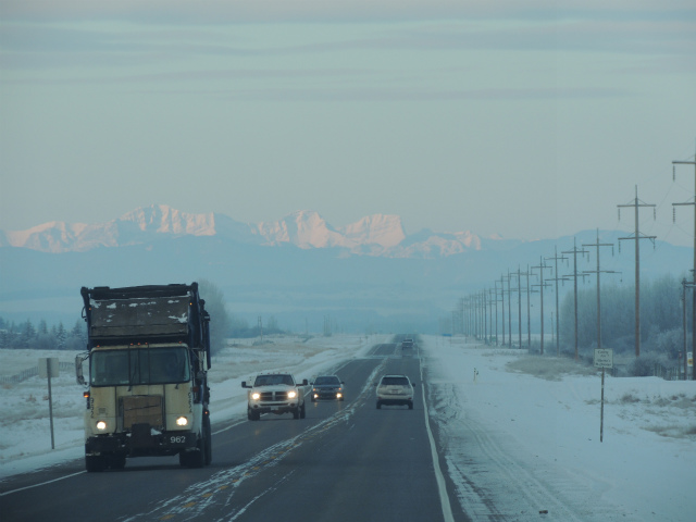 カルガリーから実家のあるミラビルに向かうハイウェイ。遠くにロッキーマウンテンが見えます。