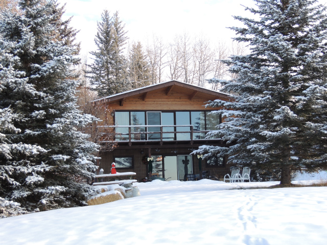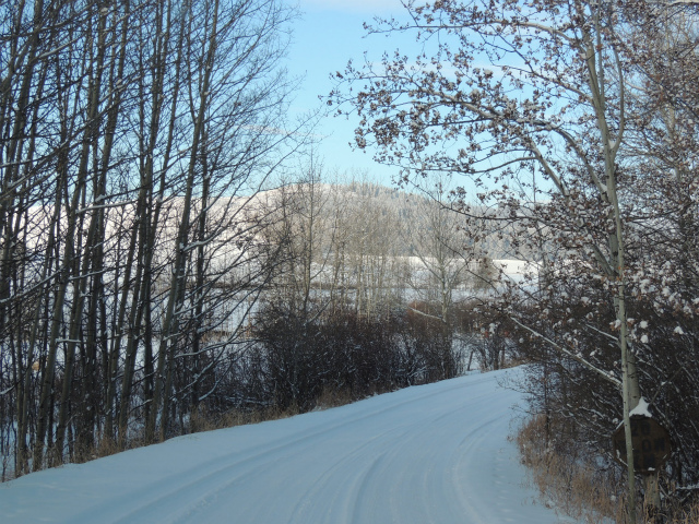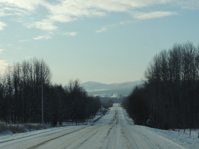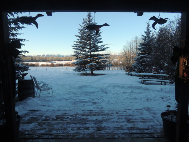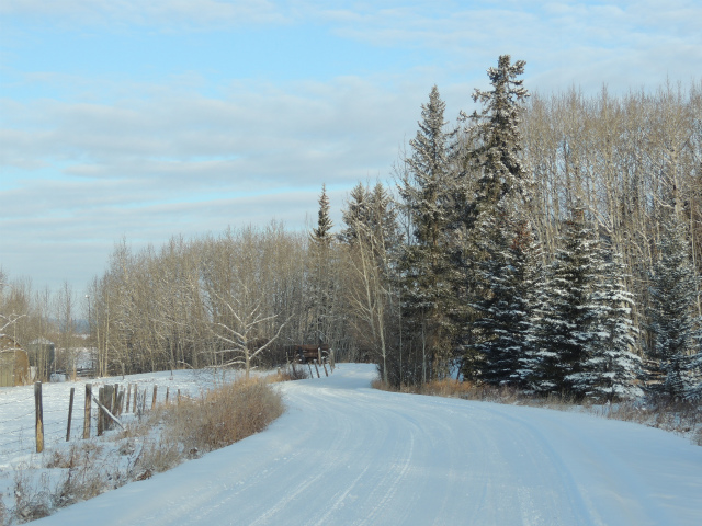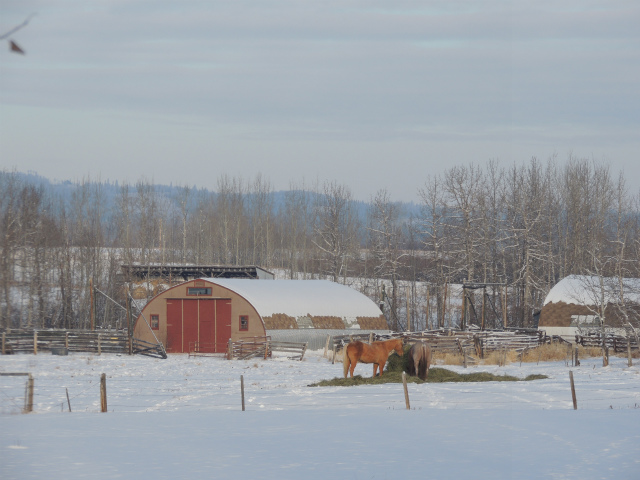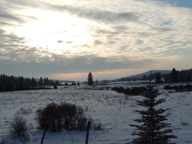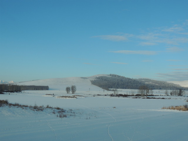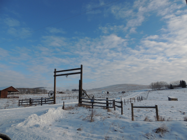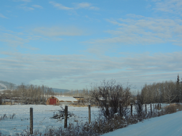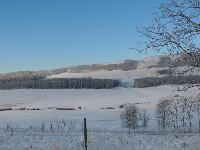 お母さんの牧場です。昔は向こうの丘の上までだった敷地は、今は丘の手前まで。手前に池があるのですが、凍った上に雪が積もっているのでどこだかはっきりわかりません。