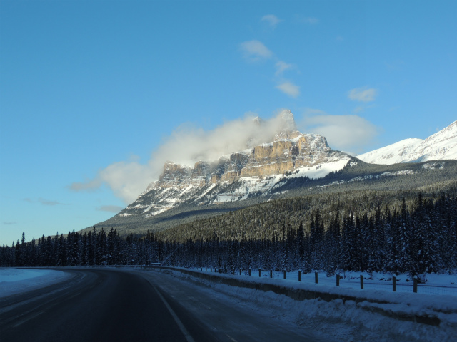 Lake Louise への分岐も通過。日本でカナダ旅行のパンフレットを見るとかならず出てくる、バンフとレイクルイーズはどちらも、険しいロッキー山脈の中のほんとうに美しいエリアです。レイクルイーズを過ぎてしばらく行くと、アルバータ州からブリティッシュ・コロンビア(BC)州に入ります。