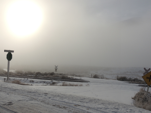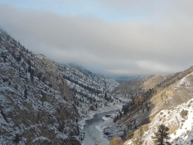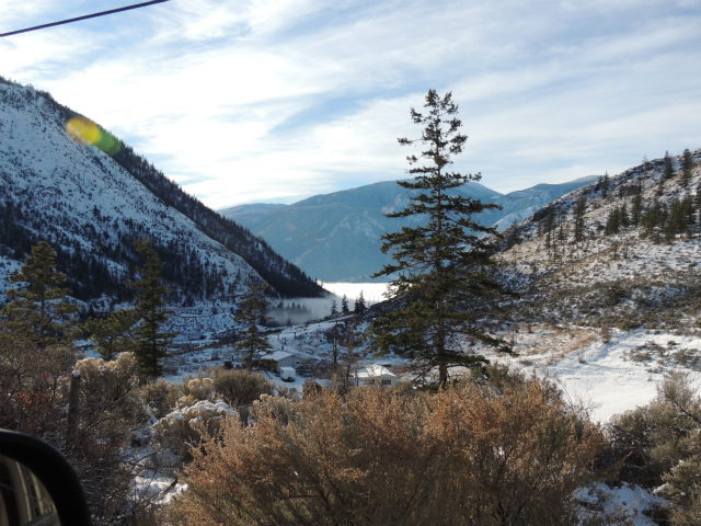 まもなく Lillooet というところまで来ると、この先の山の間に霧が立ちこめているのが見えます。