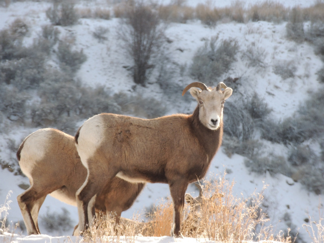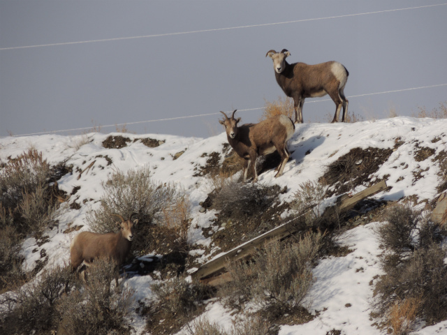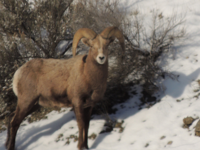 霧を抜けると陸が崖の上にいるビッグホーン・シープを発見。陸はとにかく野生動物を見つけるのが得意です。車を停めてくれたので、望遠レンズで撮影。