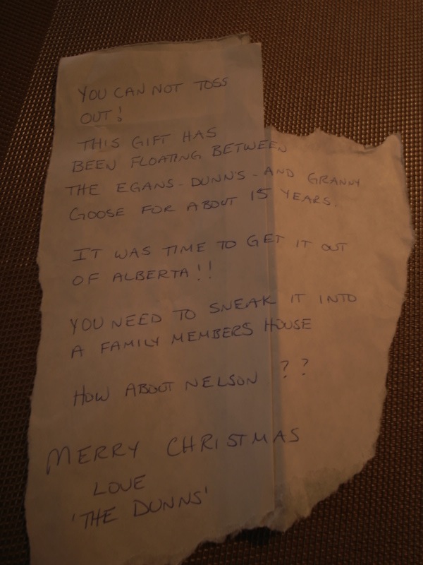 これは15年近くの間、イーガン家(ベティおばさんの家族)とダン家(ローラの家族)とグラニー・グース(陸のお母さん)の間を行き来してきたギフト。