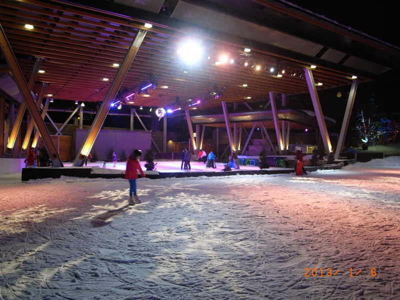 食事のあとは、ひさしぶりにヴィレッジのオリンピック・プラザにスケートしに行きました。夏の間、たくさんのフリーコンサートが行われたプラザは、冬には無料のスケートリンクになります。スケート靴のレンタルは5ドルですが、スケート靴を持参すれば無料です。