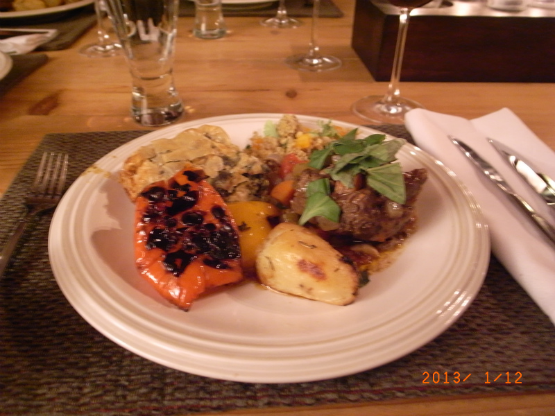 ラムのハーブ煮に、ほうれん草のパイ、キノアのサラダ、ポテト、バーベキューした野菜が添えられていました。ラムの煮込みはスパイスが効いてとても美味でした。マーティは消防士をしていた時期があり、大人数の食事の支度に慣れているといいますが、料理の腕前もなかなかのものです。
