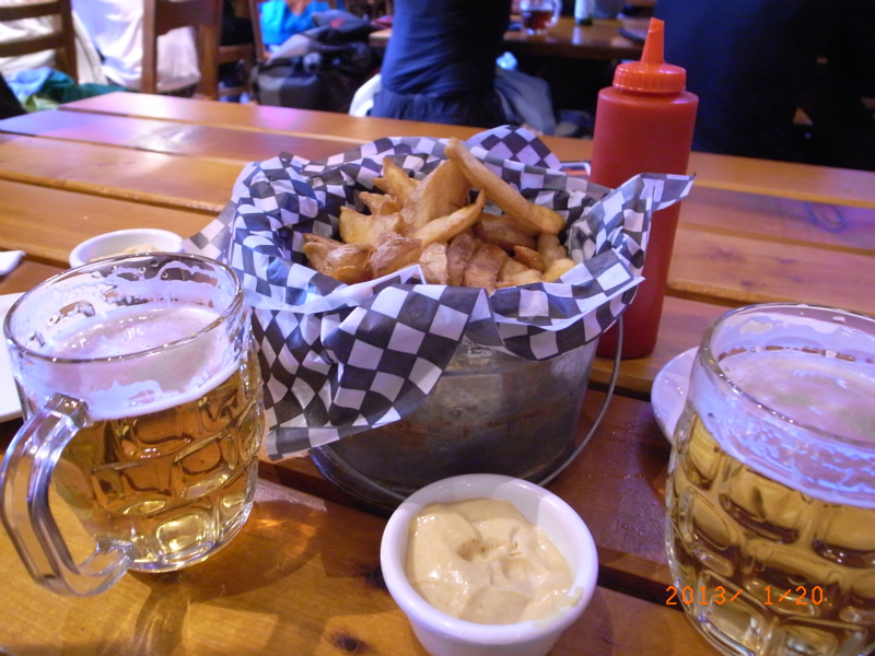 スキーのあとはいつも腹ぺこの私は、ビールだけでは足りません。おつまみのフライドポテトを注文するとバケツに入ったポテトがどっさり出てきました。食べきれるかと心配でしたが、二人で難なくクリア。