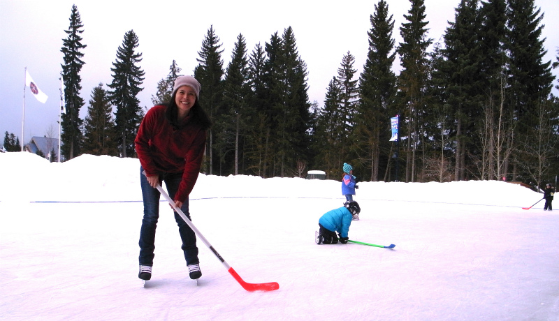 ホッケー・スティックを持っていると自然に前傾姿勢をとるので、安定感が増します。しばし Hiromi とパックをパスしあいながらスケートを楽しみました。