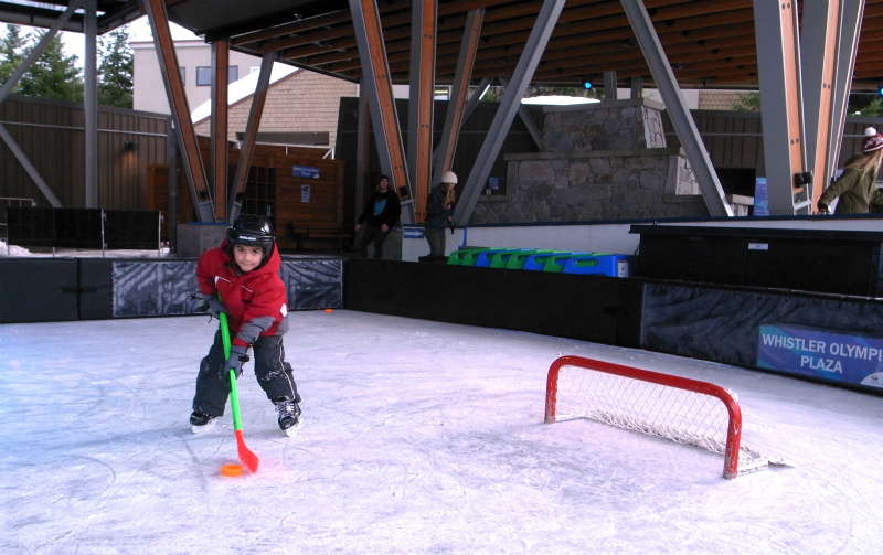 3歳くらいと思われる男の子がゴールを守っているので、何度か彼を相手にシュート! まだスケートもおぼつかないけれど、真剣にゴールを守っていました。カワイイ〜
