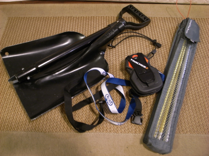 ショベルと、プローブ、そしてビーコン。ビーコンはスキーを始める前に電源をオンにして発信器としておきます。パートナーが雪崩に巻き込まれて埋もれた場合は、ビーコンをサーチモードに切り替えてパートナーの埋もれた場所を特定。つぎにプローブで雪を突き刺してさらに場所や深さを特定。プローブはアルミ製?の筒のなかにワイヤーが通してあって、ちょうど折りたたみ式の杖の要領で中央のワイヤを引くと2.4メートルの細長い棒になります。それからショベルで雪を掘って救出することに。