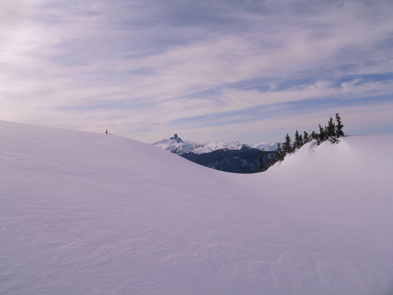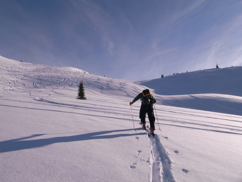 陸は最初からいずれ私をバックカントリー・スキーに連れて行くつもりでいたため、私の買った中古のスキーはすべてバックカントリー・モード、スキンもセットで購入していまいた。プローブとショベルは陸が予備を持っていたので、足りないのはビーコンだけですがこれが最も高価で300ドル以上します。もちろんレストランもないので、多めのランチと飲料水、暖かいお茶なども持って行かなければならずバックパックはけっこうな重さ。そんなハードなスキーが好きになれるかどうか怪しいので、ネットで雪崩の危険度も低となっている事を確認して、この日は安全なスキー場のすぐ脇の境界外へビーコンなしで出かけることに。