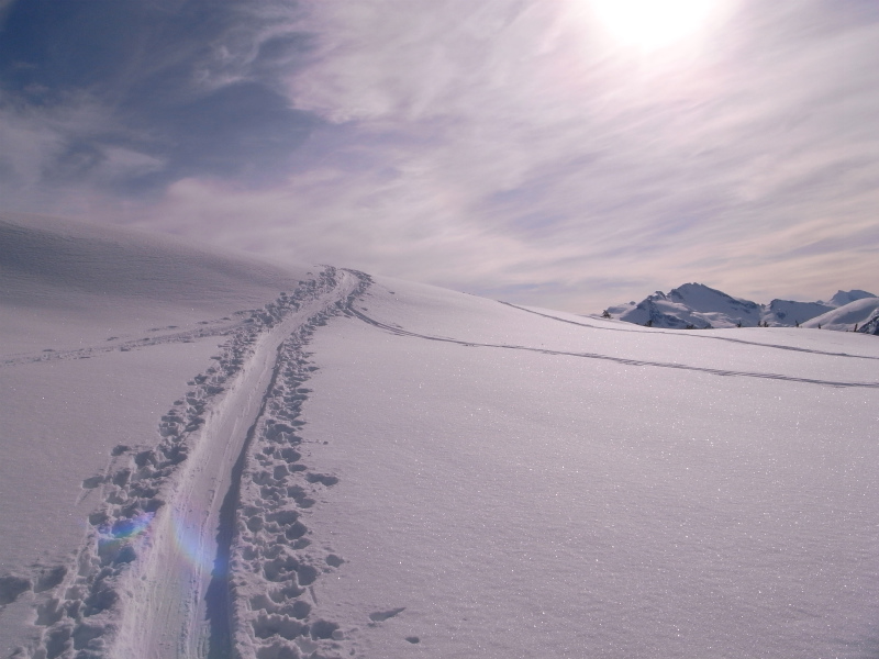 バックカントリー・スキーは、スキー場ではない場所でスキーをすること。ヘリコプターで行く場合は、ヘリ・スキー、スノー・モービルなどで行く場合はキャット・スキーですが、スキーの裏にスキンをつけて、山を登って行く場合は、スノー・ツーリングといいます。日本では山スキー、山岳スキーと呼ばれるもの。