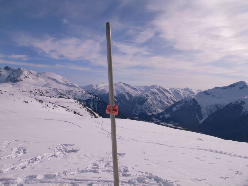 まずはスキー場のゴンドラとリフトを乗り継いで頂上まで行ってから、境界外へトラバースします。ここから境界外の標識。