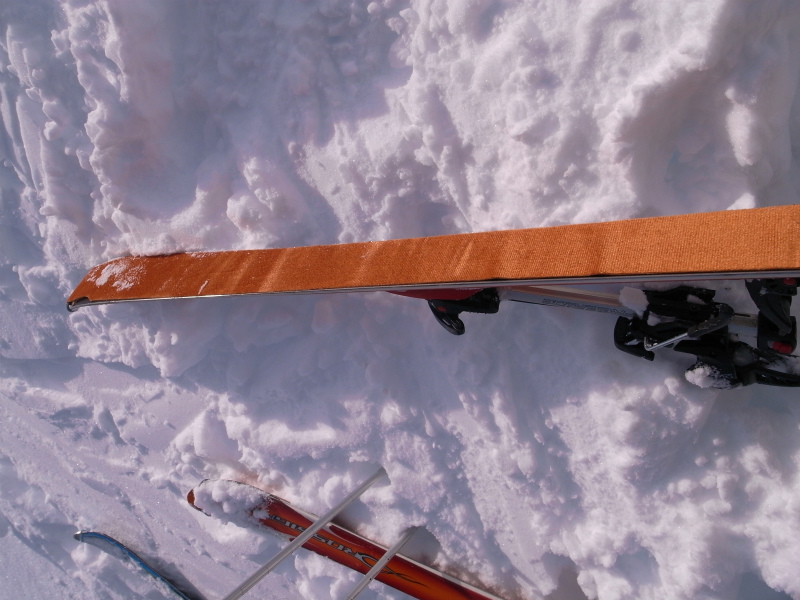 さらに、バックカントリー・スキー用のブーツ、ビンディング、そして山を登るときにスキーの裏に貼付けるスキンが必要に。ビンディングは山を登るときのみ踵が浮くように切り替えができるようになっています。