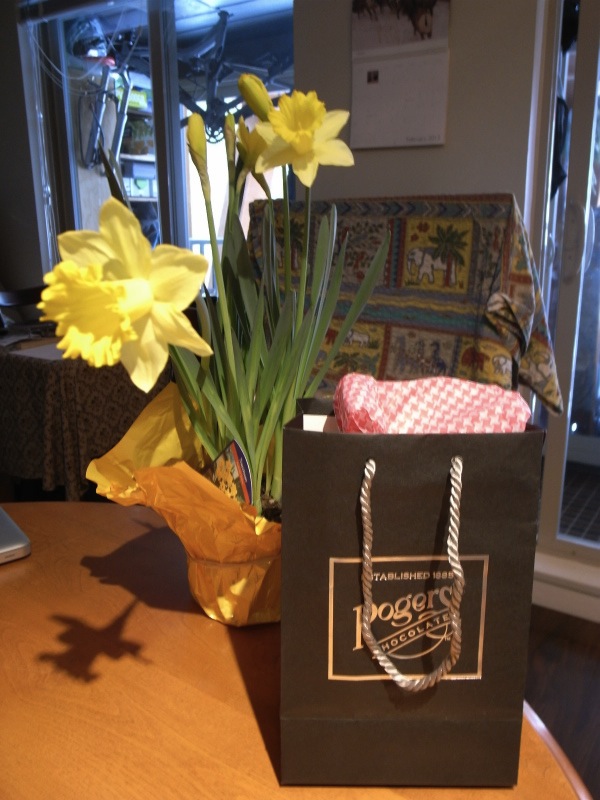 ラッパ水仙の鉢植えと、チョコレートが!! 前日、帰りが遅いと思っていたら、バレンタイン・ギフトを買いに行ってくれていたようです。