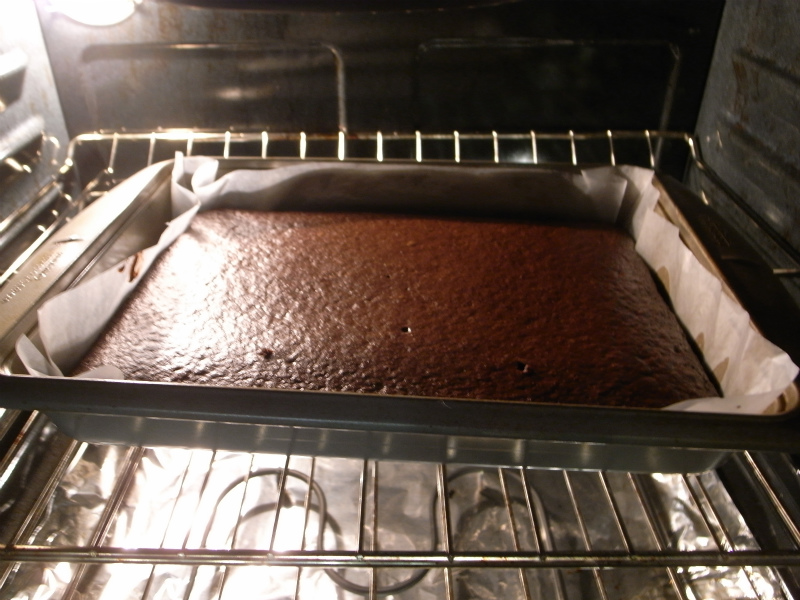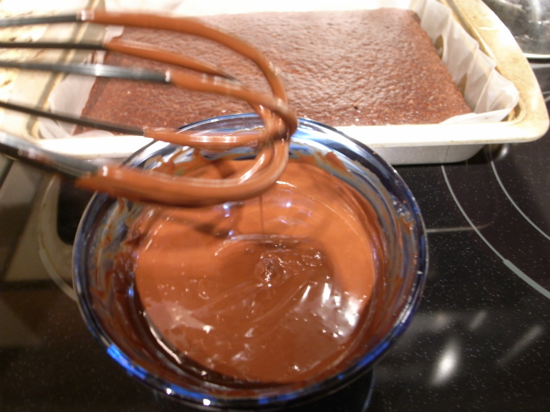 すこしスポンジが冷めてからダークチョコレートと生クリームを混ぜたトッピングを流し込んでできあがり。