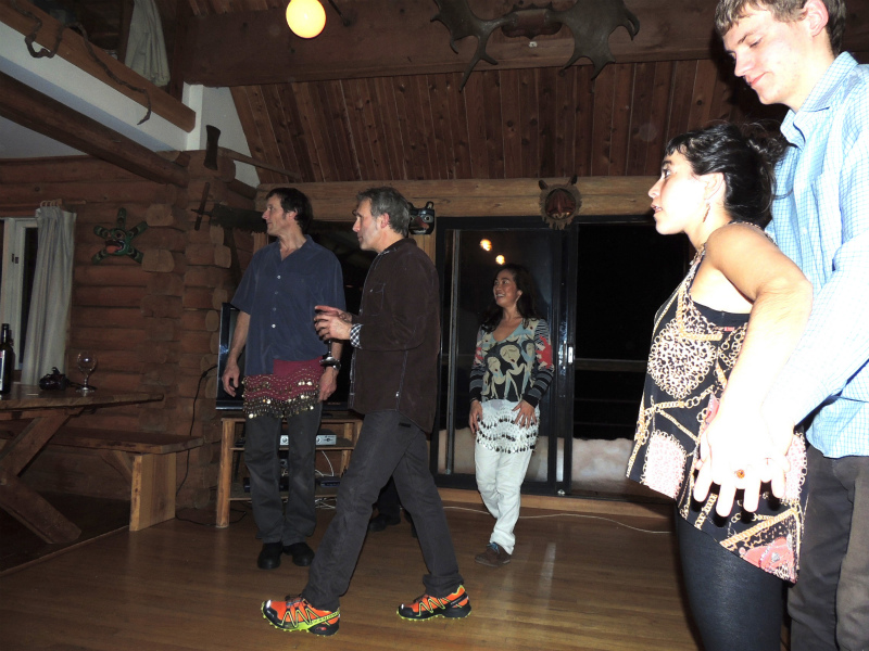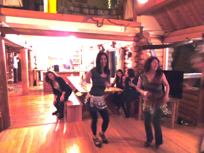 誰かが持って来たスパンコールフリルの付いたスカーフを腰に巻いてベリーダンスのように腰を振ります。